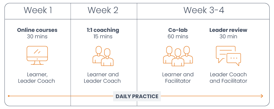 Only 2 hours per month, over a continuous monthly cycle. This creates lasting change because learning is layered over time and skills build on each other.